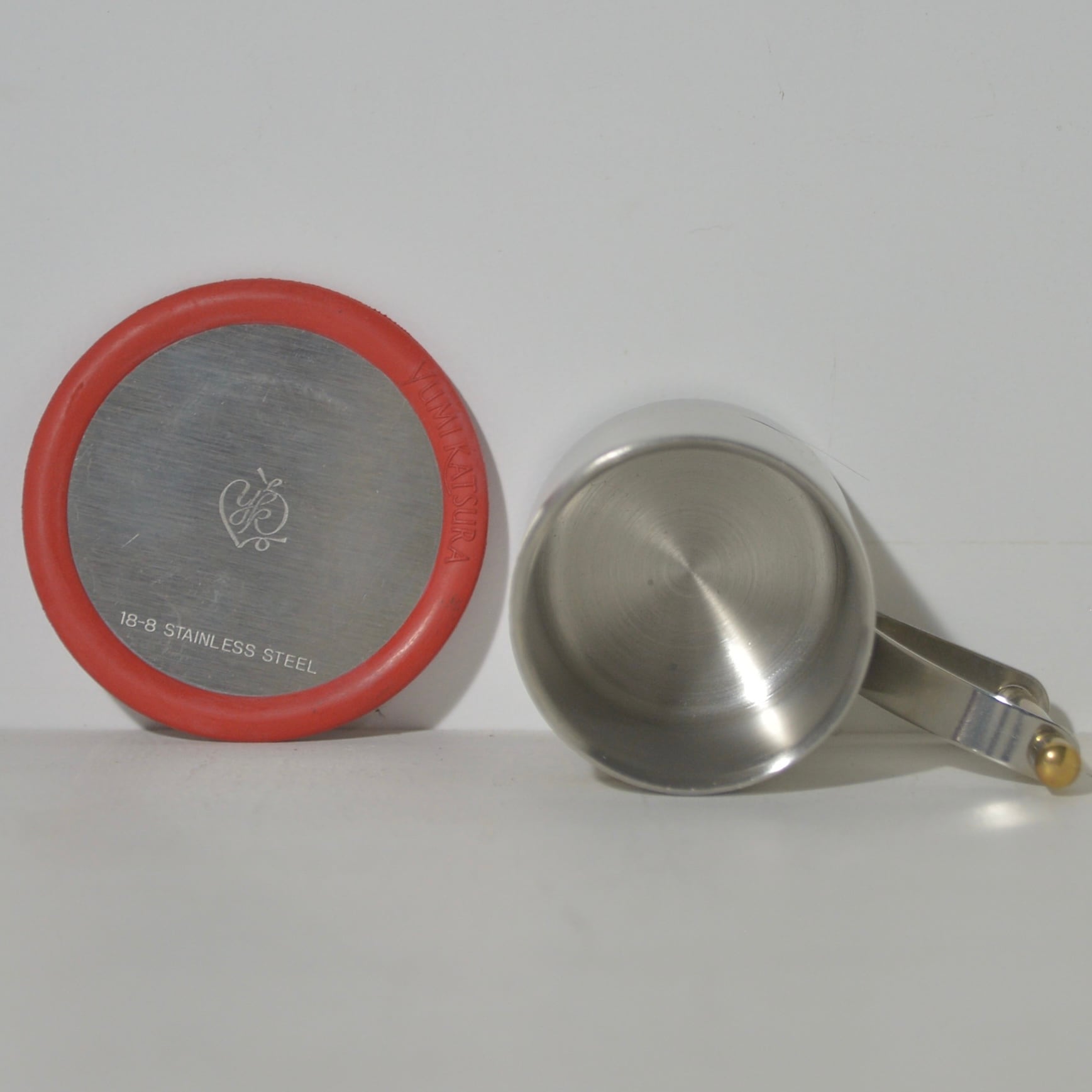 ブライダル&フォーマルウェアの企画・製造・販売の会社、YUMI KATSURAのステンレス製カップ&ソーサーです。ソーサーの縁には、ゴムが付いてます。