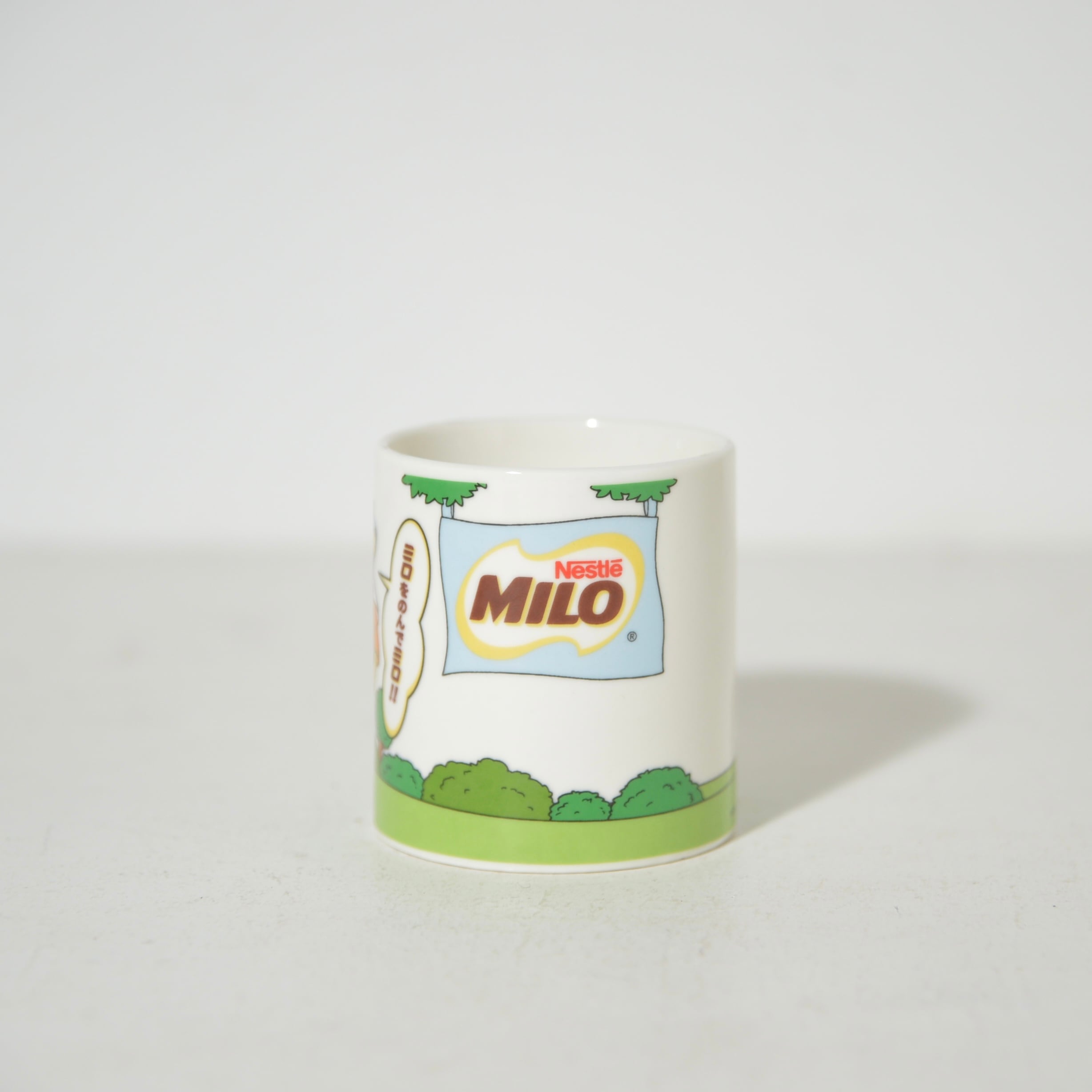 世界的な食品・飲料メーカーのNESTLÉのココア味の粉末麦芽飲料のブランド、「MILO」のノベルティのマグカップです。2005年に当時TV・雑誌で人気のキャラクター「かいけつゾロリ」をデザインした数量限定のオリジナルマグカップになります。マグの持ち手が「3」の形の野球バージョンと「6」の形のバスケットボールバージョンの2種類あり、2つ合わせると「3」「6」、「ミロ」と読めるそうです。