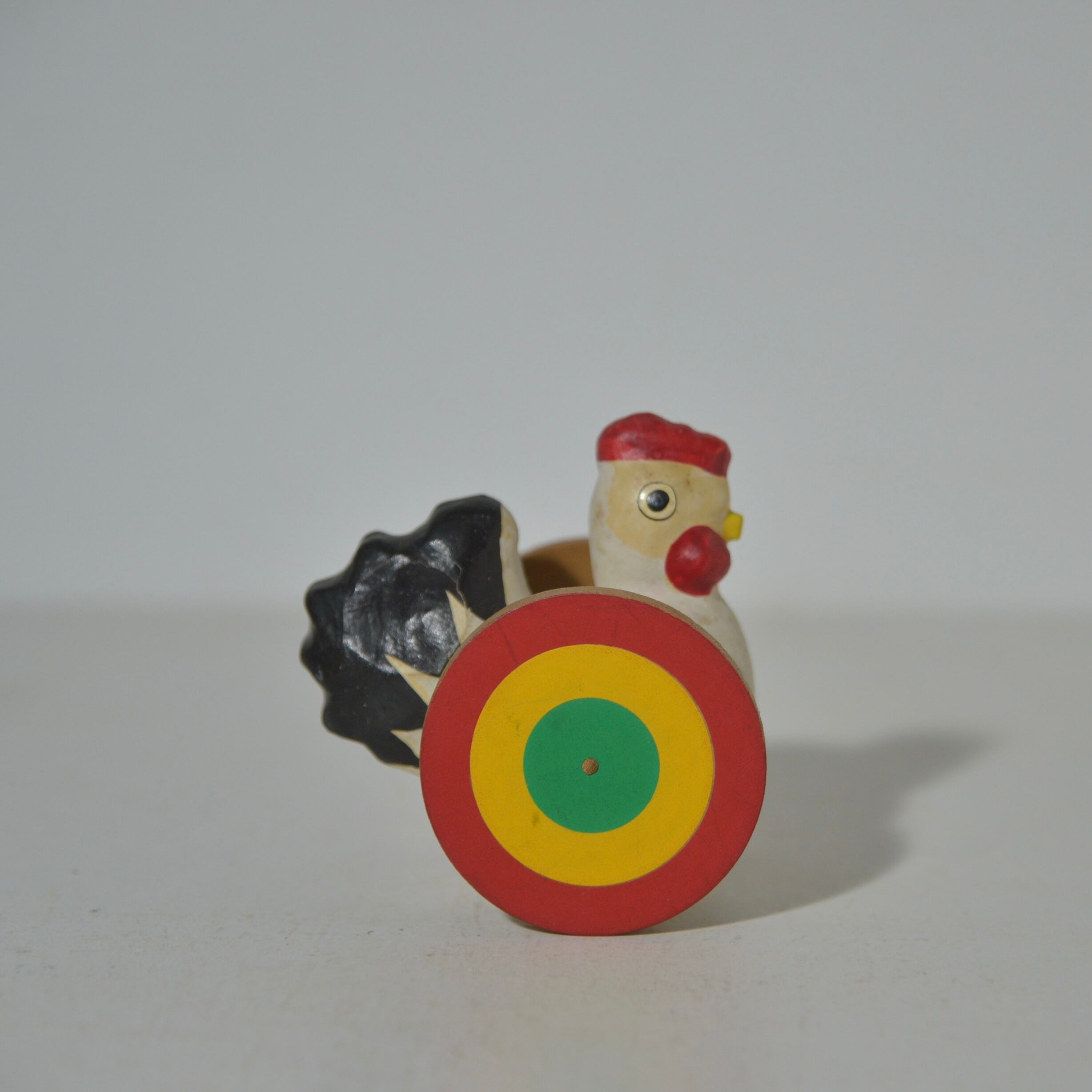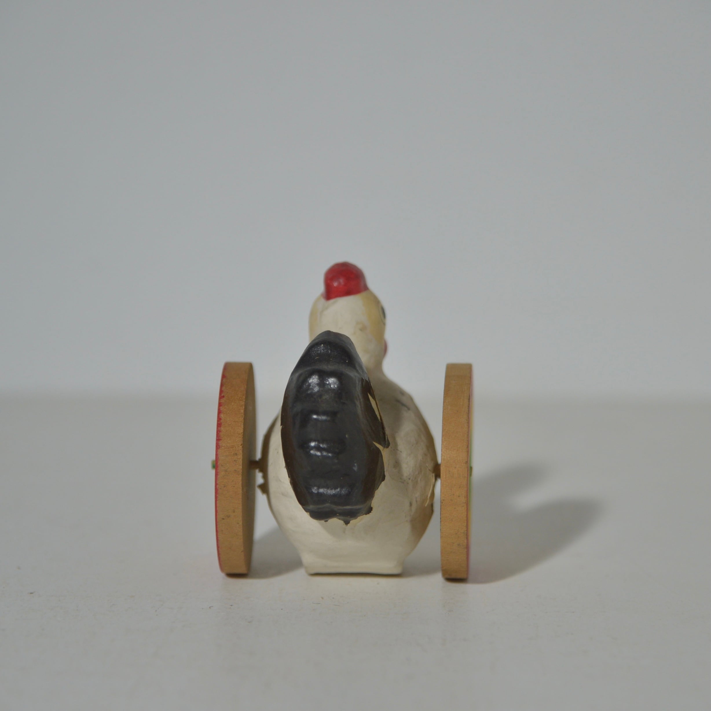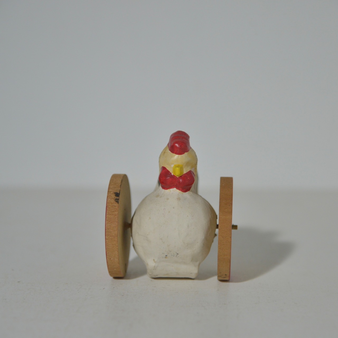 福島県郡山市の郷土玩具、三春張り子のとっと車です。鶏本体の張り子は紙製で車輪は木製です。