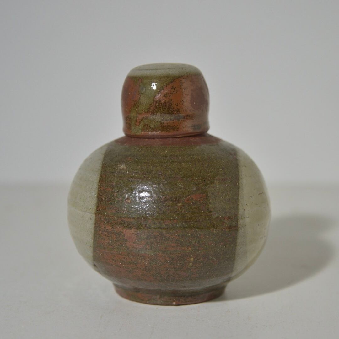 丸紋が描かれた蓋付の丸甁です。窯元は不明。作風から沖縄作られた作品のではないかと思ってますが、詳細は不明です。