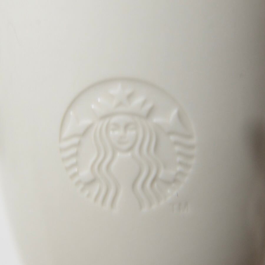 アメリカのシアトル発の世界最大コーヒーチェーン、STARBUCKS(スターバックス)のコーヒーカップです。スターバックスのロゴが白いボディにシンプルにあしらわれてます。ハンドル上部には、サイズを示すShortのSの文字が刻まれてます。店内で使用されてるのと同じマグカップです。
